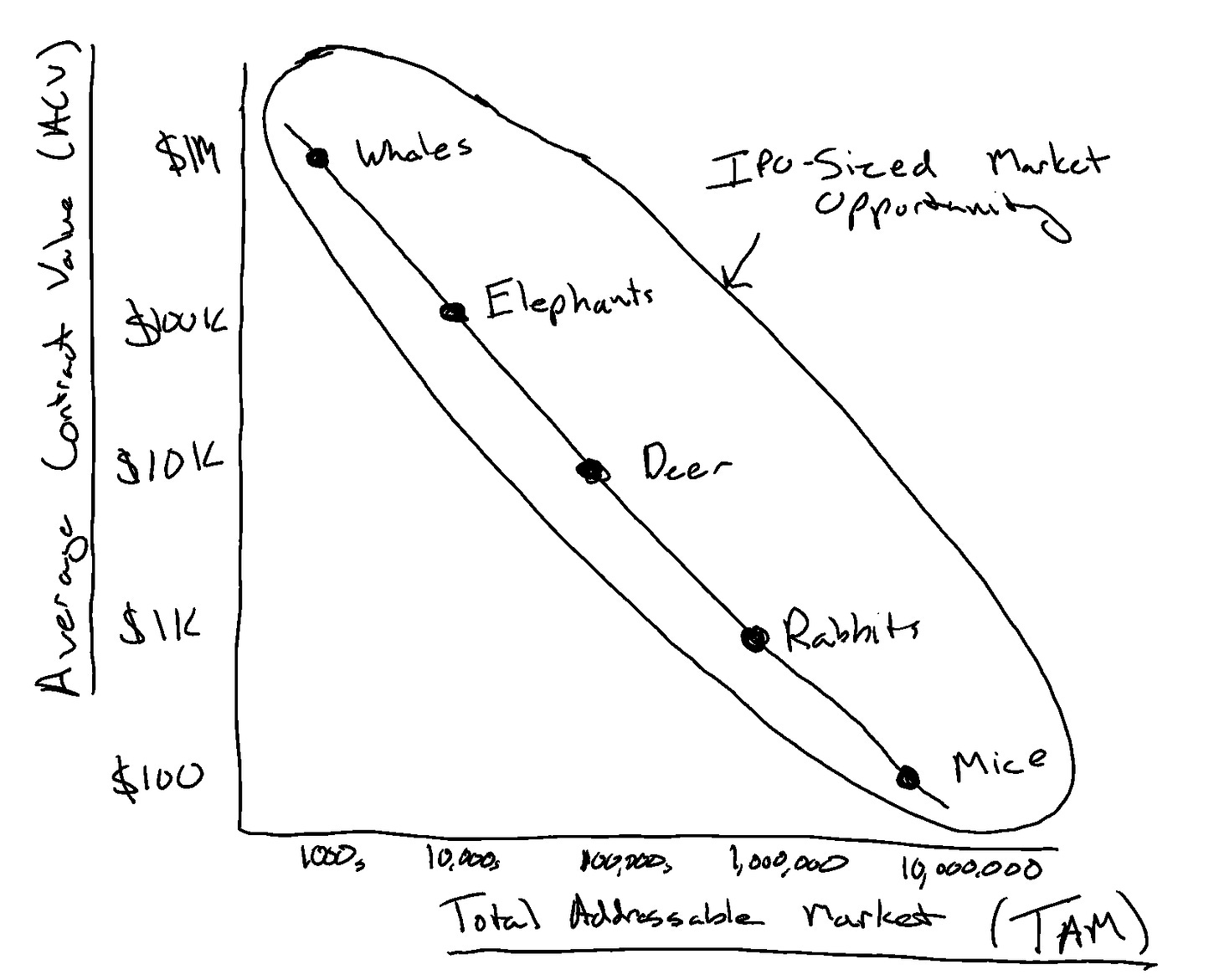 First, what is an IPO-sized market opportunity? Today, to go public you need $200M+ in revenue. Further, market leading companies often only get to 10-15% market share. So that means, for example, if you have 2,000 companies in your total addressable market and execute really well, you might land 200 of these companies in 8-10 years. Therefore, in order to go public, you need $1M+ deals.
